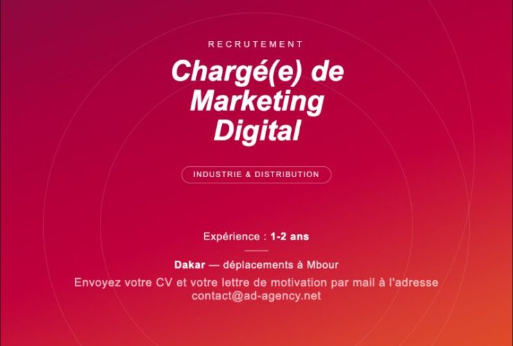 Recrutement pour un client de l’industrie et de la distribution ! Chargé(e) de Marketing Digital — Dakar, Sénégal avec des déplacements ponctuels à Mbour Une entreprise en pleine croissance cherche son/sa futur(e) pilote digital : quelqu’un capable de coordonner des agences, ...